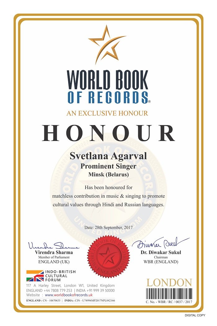 Белорусская певица Светлана Агарвал, известная в Беларуси как единственная исполнительница индийских песен была внесена во Всемирную книгу рекордов Лондона. Награда в номинации «Выдающиеся мировые исполнители» за вклад в развитие культурных отношений Индии и Беларуси через песни на языке хинди будет вручена на острове Маврикий.