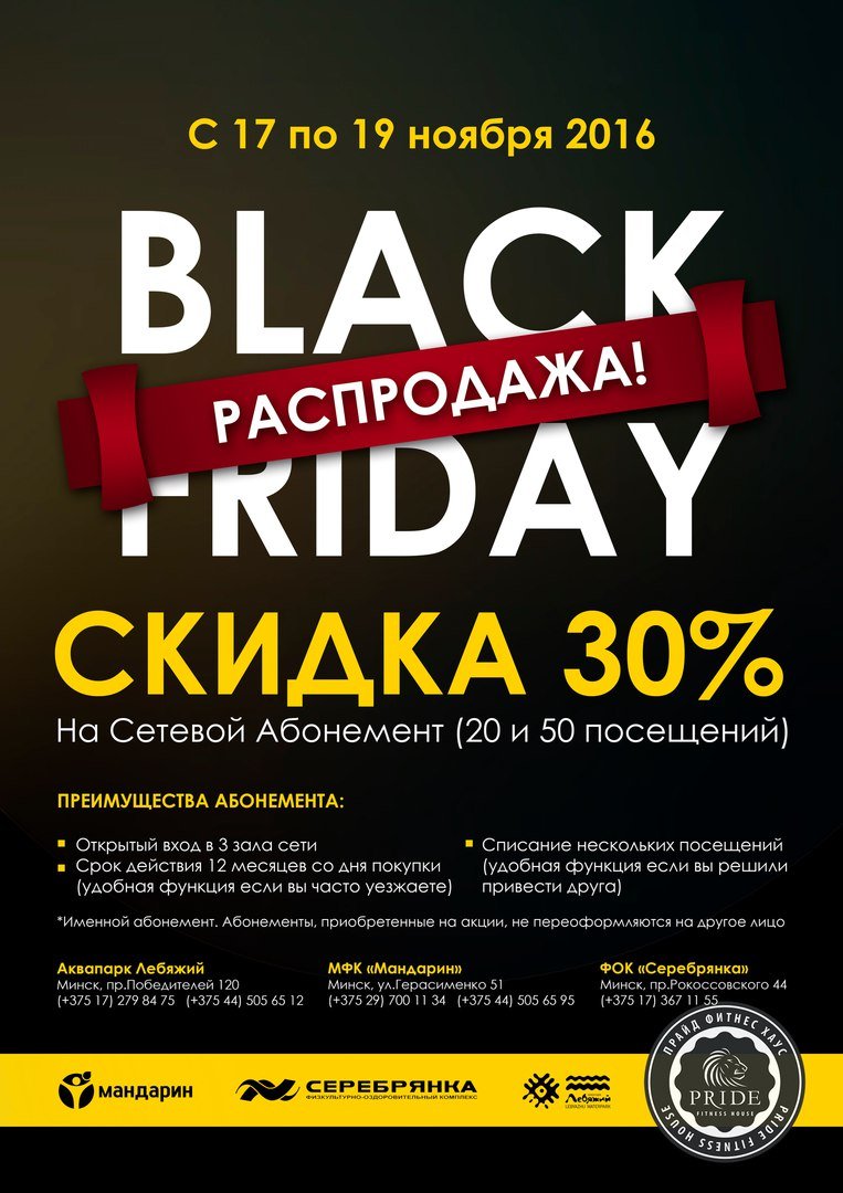 Скидка 30% на Сетевой Абонемент с 17 по 19 ноября в Pride Fitness House