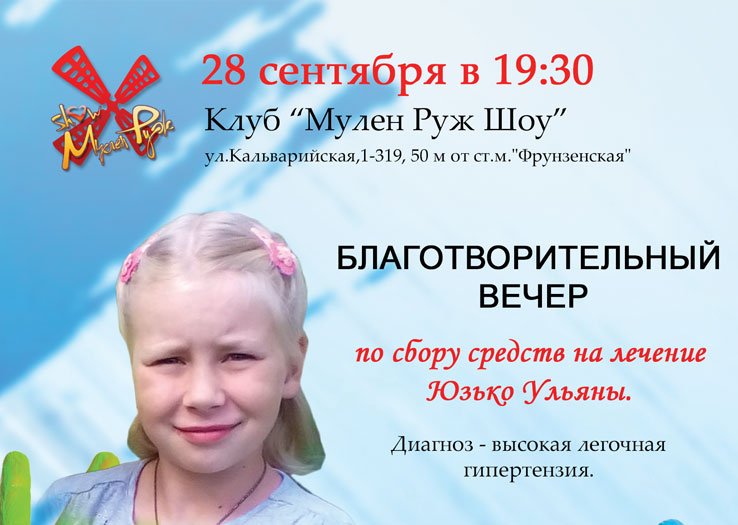 Благотворительный вечер «Доброе сердце» по сбору средств на лечение Юзько Ульяны состоится 28 сентября в 19.30 в клубе «Мулен Руж Шоу» по адресу: г. Минск, л.Кальварийская 1