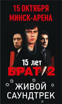Осенью 2015 года в Санкт-Петербурге с аншлагом прошел концерт, на котором была воссоздана атмосфера культового фильма. На сцену вышли легендарные исполнители и группы, чтобы спеть любимые песни нескольких поколений. 19 мая живой саундтрек к «Брат-2» прозвучит в Москве, а 15 октября окунуться в эту атмосферу смогут и минские зрители. Вячеслав Бутусов и «Ю-Питер», «Би-2», Вадим Самойлов, Настя Полева, «Смысловые Галлюцинации», Глеб Самойлов & The Matrixx со сцены Минск-Арена исполнят свои легендарные песни, чтобы вместе со зрителями снова почувствовать всепоглощающую свободу жизни.