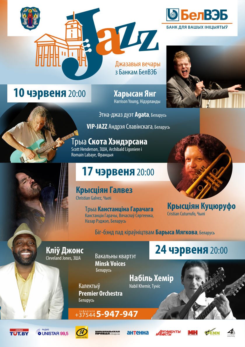 10, 17 и 24 июня в Минске у Ратуши пройдут концерты пятого сезона проекта «Джазовые вечера с Банком БелВЭБ», на которых выступят музыканты из США, Нидерландов, Франции, Чили, Туниса, Туркменистана и Беларуси. Начало мероприятий в 20:00, вход свободный.