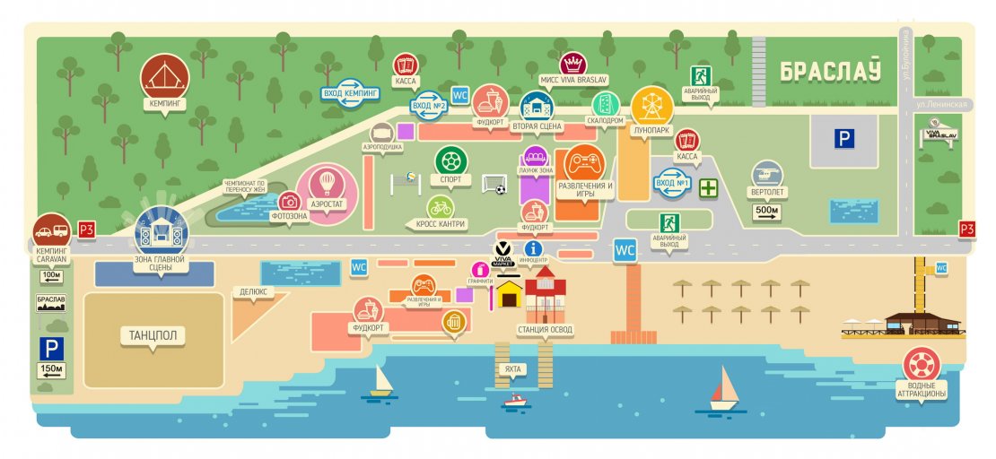 Дневная программа. Фестивальная площадка открывается в 10.00. Следом начнет работу вторая сцена, где будут выступать электронные ди-джеи. В 11:00 – торжественное открытие спортивной части фестиваля, после чего стартуют матчи по пляжному волейболу и футболу, а с 12:00 зрители смогут наблюдать за официальным международным соревнованием – кубком Беларуси по вейкборду. В это же время стартует велосипедная гонка в дисциплине кросс-кантри. С 14:30 на второй сцене будет проходить финал конкурса Miss Viva Braslav.