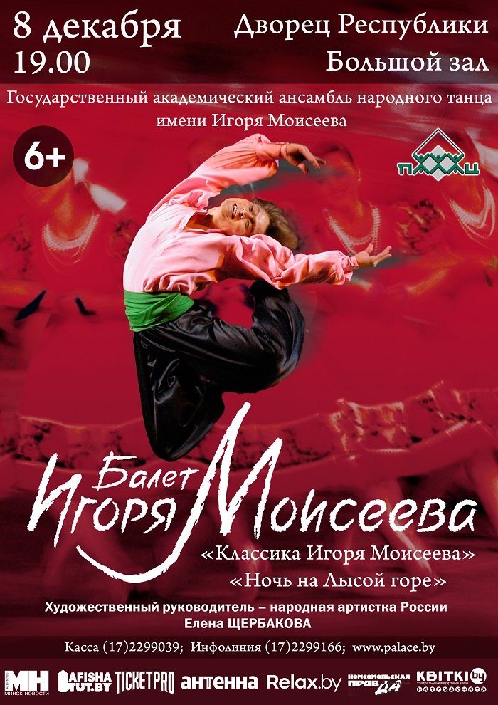 Государственный академический ансамбль народного танца имени Игоря Моисеева возвращается в Минск! 8 декабря 2017 года, во Дворце Республики Балет Игоря Моисеева проведет сольный концерт, посвященный 80-летию ансамбля.