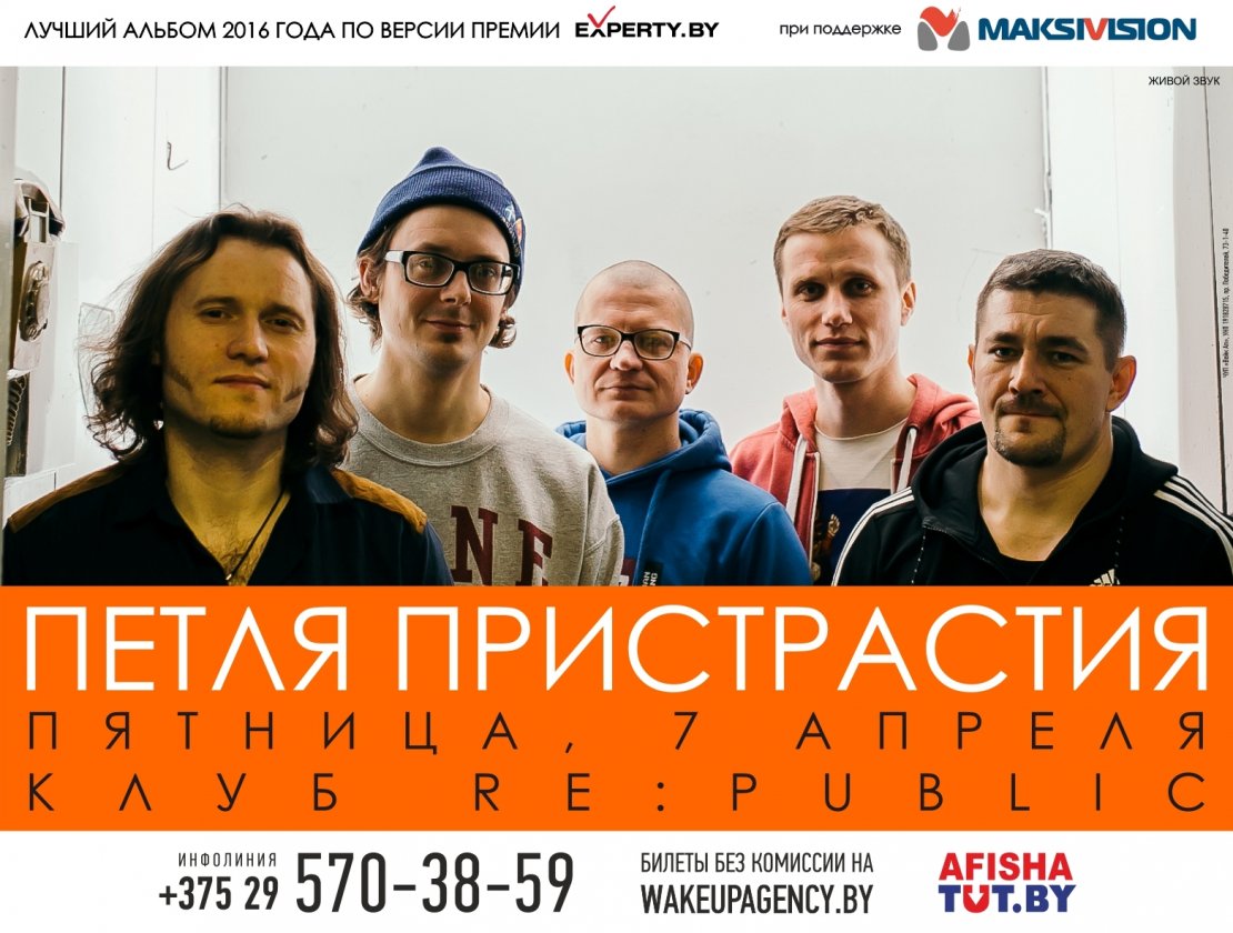 7 апреля в клубе Re:Public большой сольный концерт группы «Петля Пристрастия». Начало в 19.00. Билеты от 20 руб. Продажа без комиссии: на сайте www.wakeupagency.by и магазине Stuff (ТЦ «Московско-Венский», пав. 363). С комиссией: кассы Kvitki.by, Bezkassira.by. Инфолиния: (029) 570 38 59.
