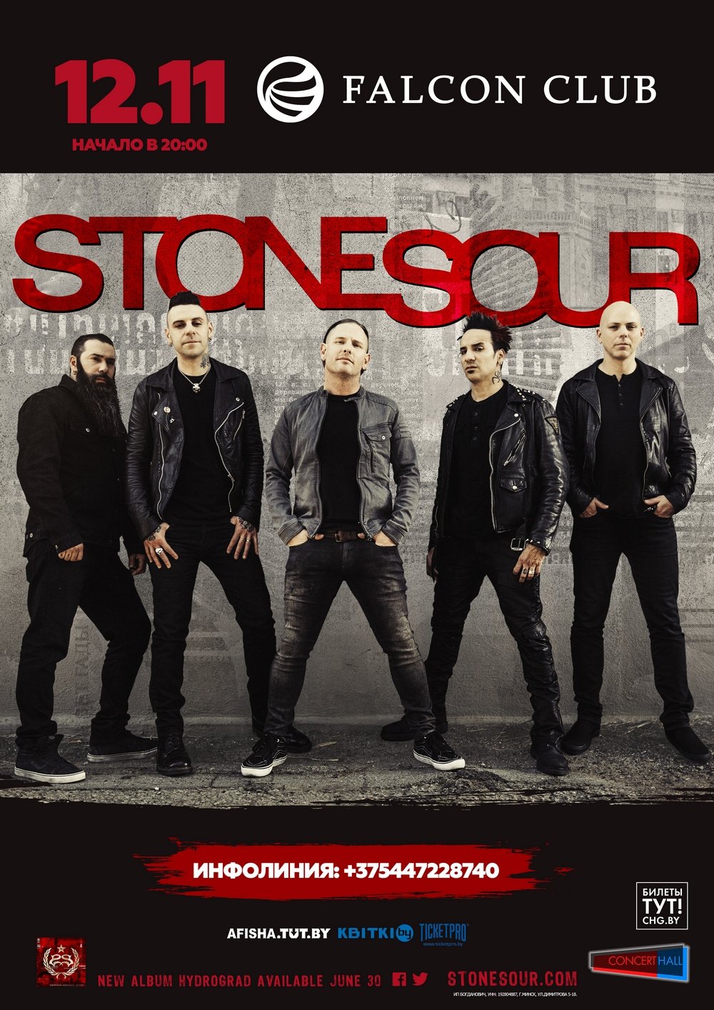 12 ноября в минском зале Falcon Club состоится концерт американской метал-группы Stone Sour, лидером которой является вокалист Slipknot Кори Тейлор. Музыканты приведут лучшие песни и новый альбом «Hydrograd», который должен выйти в конце июня.