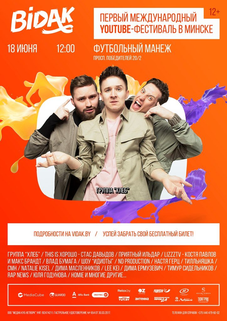18 июня в Футбольном манеже в Минске пройдет международный фестиваль “Вiдак”, в котором примут участие одни из самых популярных блогеров русскоязычной интернет-среды. Среди хедлайнеров мероприятия Стас Давыдов, группа ХЛЕБ, Макс Брандт, Костя Павлов, Приятный Ильдар, Настя Герц, Влад Бумага (A4), Дмитрий Масленников, Тимур Сидельников, Руслан Тушенцов (CMH), Наталья Володина, Андрей Немодрук (ND Production), Lee Kei (DaiFiveTop), Наталья Кисель, Дмитрий Масленников, Алексей Столяров и многие другие. Общая аудитория заявленных участников – более 20 млн. зрителей, а суммарный аудиторный охват - более 2 миллиардов просмотров.