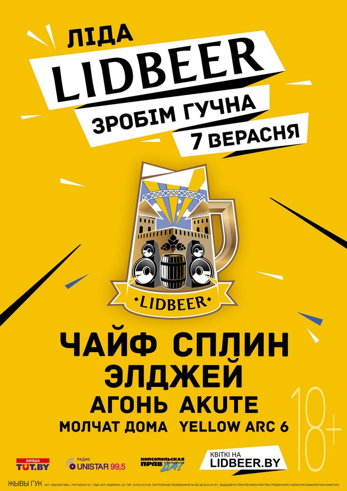 За пять лет LIDBEER стал одним из самых ожидаемых событий года. 2019 год – юбилейный для фестиваля, поэтому open air удивит своим масштабом. 7 сентября нас ждёт рекордный лайн-ап, в котором каждый найдёт что-то из своего плейлиста. Будет панк, танцевальный грув, русский рэп и старый добрый рок-н-ролл. На сцене гала-концерта выступят семь групп: Yellow Arc 6, «Молчат дома», Akute, «Агонь». Хедлайнеры LIDBEER-2019 – хип-хоп-исполнитель Элджей и культовые рок-группы «Сплин» и «ЧАЙФ».